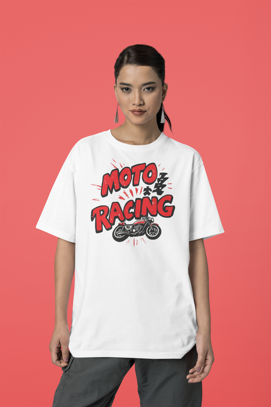 moto racing white Loose Fit - Half Sleeve -FRONT -UNISEX OVERSIZE Cotton Tshirt